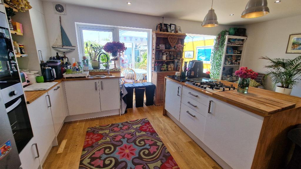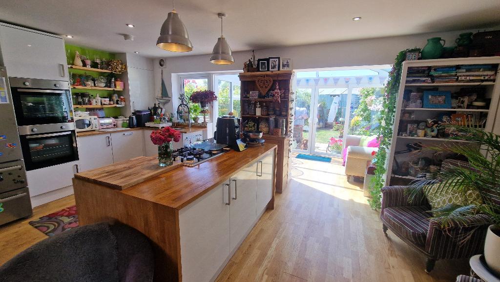Kitchen - 10' 9'' x 19' 0'' (3.28m x 5.81m) Fitted with a range of base units with wooden work surfaces over, a 1.5 bowl sink unit and tiled surrounds. A central island has a fitted with a 5 burner gas hob. Built in eye level double oven. Integrated dishwasher and space for an American style fridge freezer. Cupboard housing a Glow Worm boiler. Double glazed window to the rear and an opening into the conservatory.