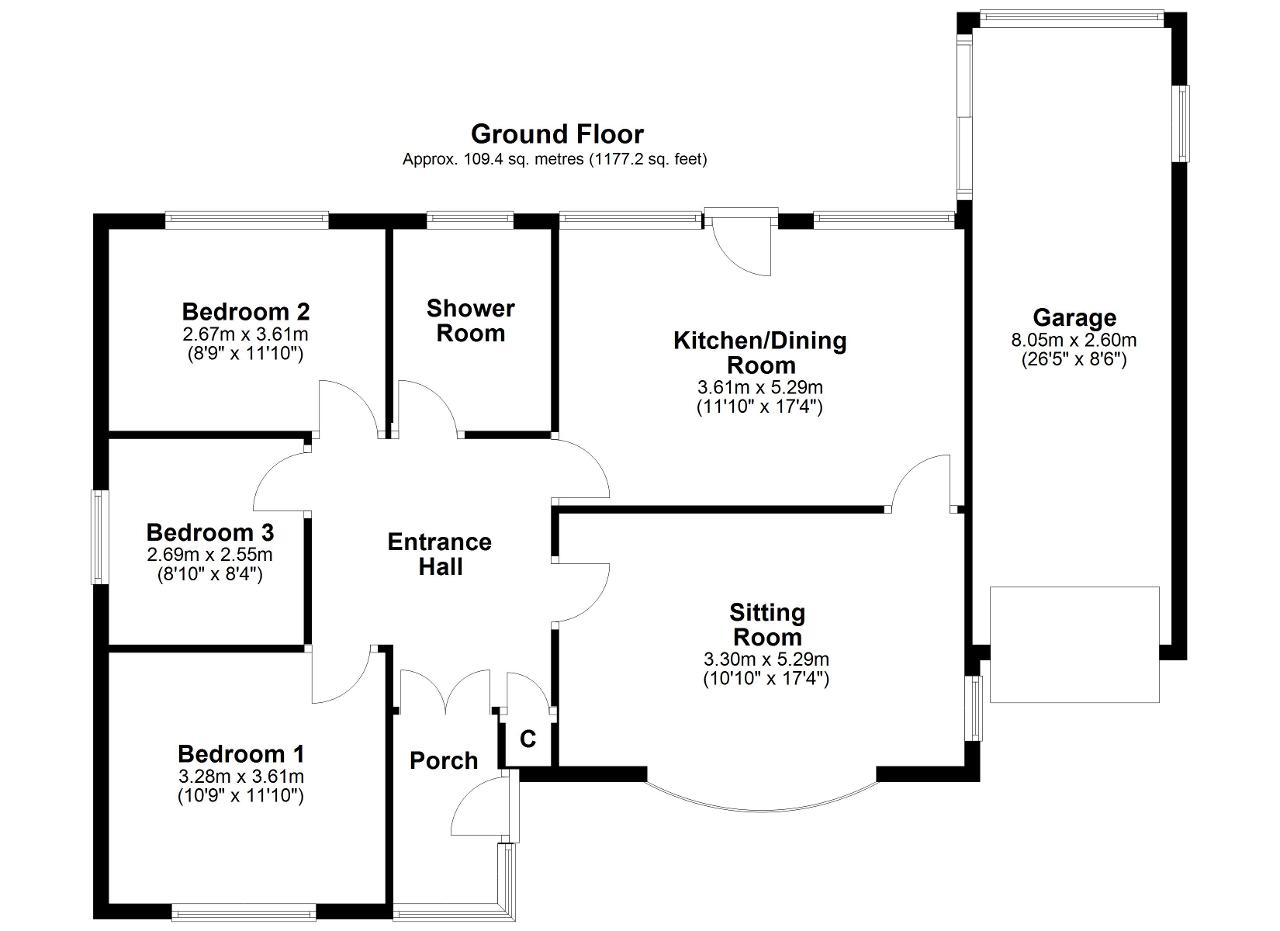 Internally, although the bungalow requires updating and modernising throughout, the accommodation is well arranged and of a good size. This is composed of a generous sized porch and entrance hall which gives access to a front aspect sitting room, a rear aspect kitchen and dining room, 3 bedrooms and a shower room.