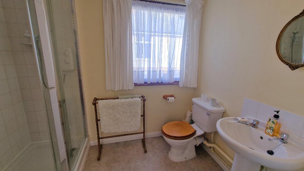 Bathroom - Fitted with a tiled shower cubicle, a panelled bath, a wash basin and a WC. Double glazed window to the side. Half height tiled walls, radiator and vinyl flooring.