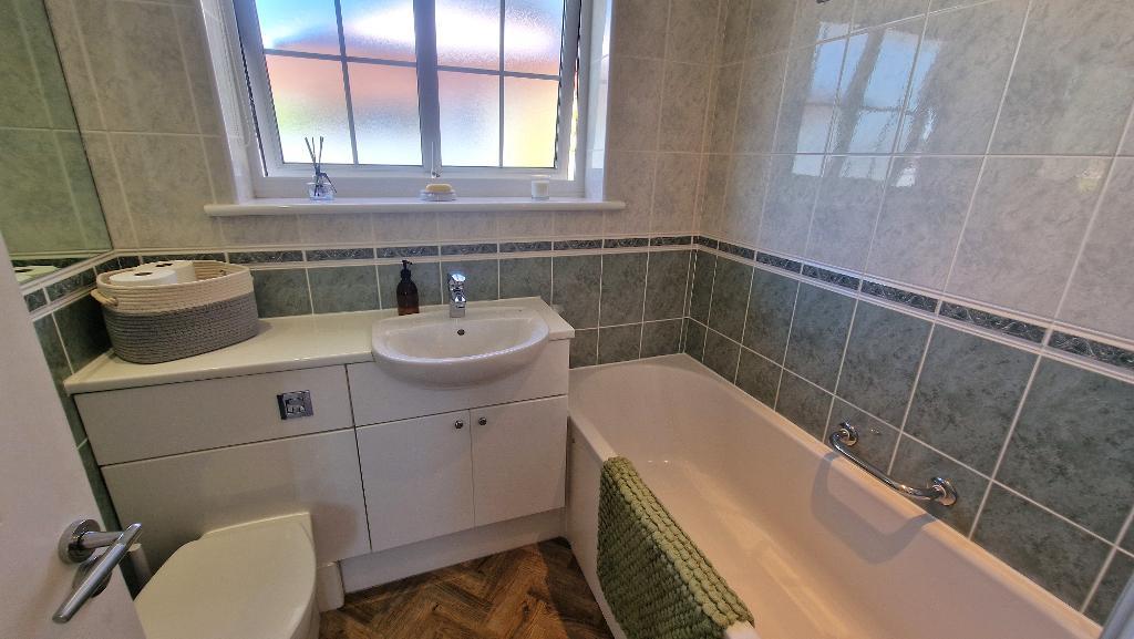 Bathroom - Fitted with a modern suite comprising panelled bath with a shower over and a glass screen, and a wash basin and a WC set in a vanity unit. Obscured double glazed window to the rear. Tiled walls, heated towel rail, extractor fan and LVT wood effect flooring.