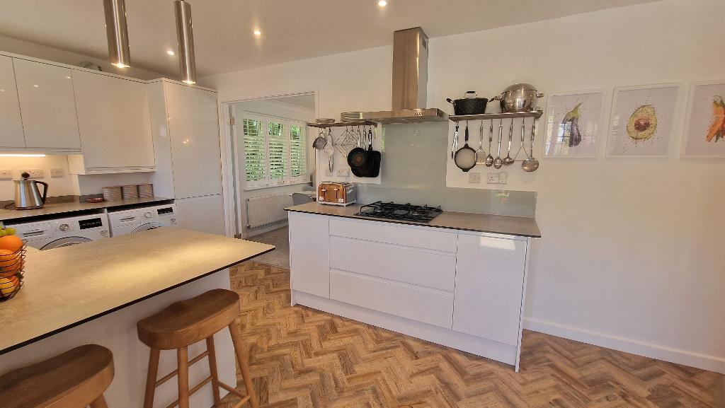 Kitchen / Breakfast Room - 8' 8'' x 20' 2'' (2.65m x 6.17m) A well designed and modern kitchen, which has been fitted with a range of wall and floor units with work surfaces over, matching upstands, an inset sink unit, a breakfast bar area and under counter lights. Built in gas hob with a cooker hood over and fitted eye level electric oven. Integrated dishwasher and fridge freezer, plumbing for a washing machine and space for a tumble dryer. Double glazed window to the rear, and double glazed door and side window giving access into the garden. Cupboard housing a Glow Worm gas boiler. Tall storage cupboard. LVT wood effect flooring.