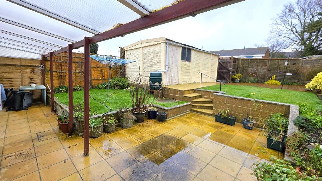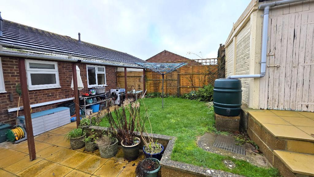 Gated side access leads through to an enclosed rear garden which has a paved patio area leading out from the bungalow. This area benefits from a covered veranda, making it the ideal spot for outside dining. Steps lead up to a second decked seating area at the rear of the garden and a lawn with planted borders. Outside tap. Rear gated access leading out to the lane from which the garage is accessed.
