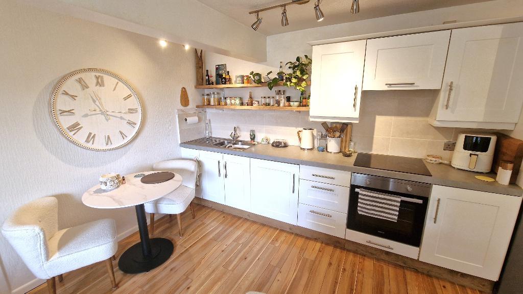 Fitted with a range of wall and floor units with work surfaces over, an inset sink unit and tiled surrounds. Fitted electric hob and oven with a cooker hood over. Integrated washing machine and space for a fridge freezer. Built in storage cupboard.