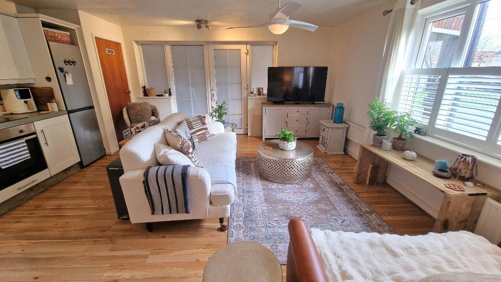 Open Plan Living Area - 16' 4'' x 16' 8'' (4.98m x 5.09m) A naturally bright and modern living area, which has a double glazed window with shutter blinds to the front overlooking the communal gardens, and obscured windows to the side. The room has wooden flooring throughout and comprises: